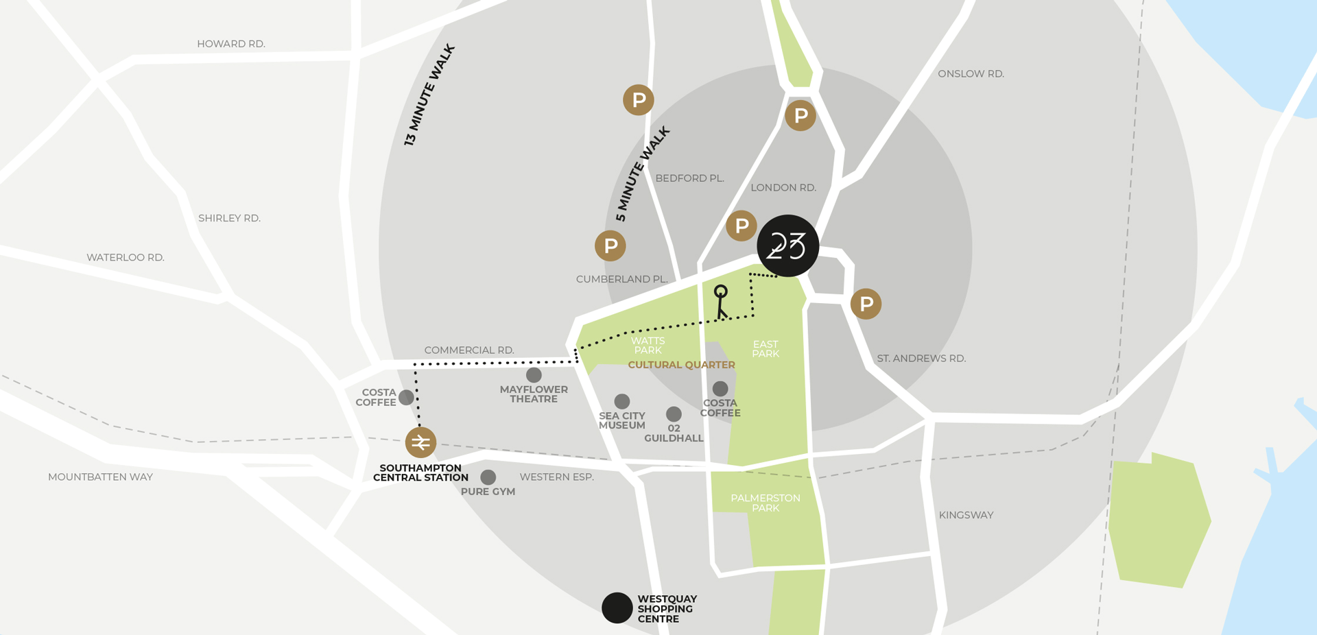 By car, Twenty3 connects directly to the A33, the main arterial route north from the city, where it connects directly to the M3 at junction 4. Heading South through the city the inner ring road links to the M27 providing easy access to the South East and South West respectively.
